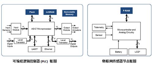上列框圖顯示了 NVRAM 的兩個關鍵任務型應用:用于自動化的可編程邏輯控制器(PLC) 以及用于流程測量的物聯(lián)網(wǎng)傳感器節(jié)點。在這兩個任務型應用中,NVRAM 獲取實時系統(tǒng)數(shù)據(jù),并用于檢測、修復故障,從而防止未來潛在故障的發(fā)生。