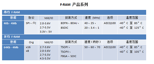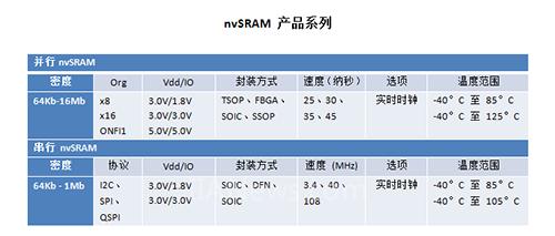 賽普拉斯提供兩種類型的 NVRAM:非易失性 SRAM (nvSRAM) 和鐵電 RAM (F-RAM)。nvSRAM是一種快速的 SRAM 存儲器,每個 SRAM 單元均嵌入了一個 SONOS 非易失性存儲單元,用于斷電時保存數(shù)據(jù)。另一方面,F(xiàn)-RAM 是一種快速寫入、高耐久、低功耗的非易失性存儲器,運用鐵電技術實現(xiàn)數(shù)據(jù)存儲。
