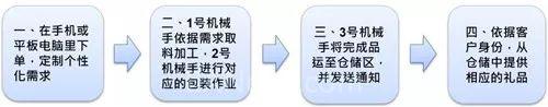 在現(xiàn)場,這條由三組臺達(dá)機器人組成的“智能制造示范線”,承擔(dān)著為來訪觀眾定制個性化禮品的責(zé)任。而這一流程是這樣實現(xiàn)的——