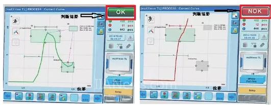 在發(fā)動機的裝配線中,有需要將活塞壓入活塞套的的工序,因為需要精密安裝,要記錄活塞被壓入活塞套的力和位移曲線,并通過設置的參數(shù)判定壓入過程是否良好,如下圖: