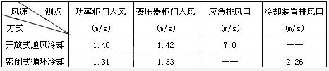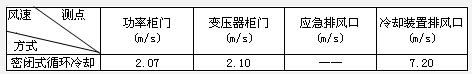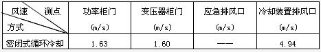 (2)當(dāng)只打開(kāi)冷卻系統(tǒng)增壓風(fēng)機(jī)采用密閉式循環(huán)冷卻時(shí),功率柜門和變壓器柜門、冷卻裝置排風(fēng)口的風(fēng)速測(cè)試數(shù)據(jù)如下: