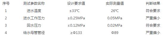 經(jīng)過(guò)對(duì)現(xiàn)場(chǎng)冷卻系統(tǒng)水路系統(tǒng)的實(shí)際調(diào)查,目前現(xiàn)場(chǎng)各參數(shù)技術(shù)條件與設(shè)計(jì)要求值之間的對(duì)比見(jiàn)下表: