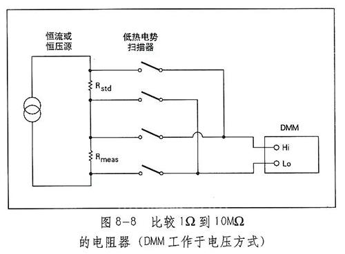 圖8—8說明使用比率技術把標準電阻器的阻值擴展到其它阻值的方法。把標準電阻器Rstd和另一個電阻器Rmeas相串聯(lián),給這兩個電阻器加以一個直流電壓或電流。測量兩個電阻器相應的電壓降Vstd和Vmeas,然后用二者之比乘以Rstd以求得Rmeas。其公式如下: