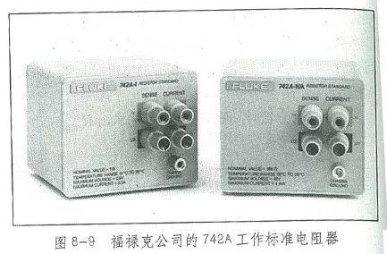 福祿克公司的742A是覆蓋1?到10 M?阻值范圍的一系列十進阻值的標準電阻器。此外還有1.9?到19 M?的標準電阻器。見圖8-9。