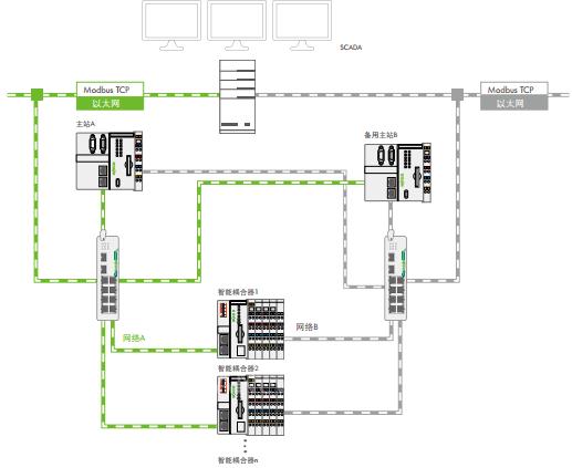 WAGO的e!COCKPIT工程軟件工具可用作控制器的編程環(huán)境。這種多節(jié)點(diǎn)編程環(huán)境可將PLC程序輕松傳輸至兩個(gè)PLC。為了使用基于應(yīng)用的控制器冗余,必須將具備必要同步功能的軟件庫與主PLC相連。該軟件還可在子節(jié)點(diǎn)與雙LAN之間建立冗余連接。子節(jié)點(diǎn)又稱智能耦合器,無需編程即可在SD卡中輕松啟動(dòng),之后可通過集成Web服務(wù)器進(jìn)行配置。智能耦合器可自動(dòng)識別模擬和數(shù)字總線節(jié)點(diǎn),過程映射也可自動(dòng)傳輸至高級主PLC。此外,主PLC可通過 Modbus-TCP協(xié)議與高級SCADA系統(tǒng)通信。冗余連接在兩個(gè)獨(dú)立網(wǎng)絡(luò)中建立。