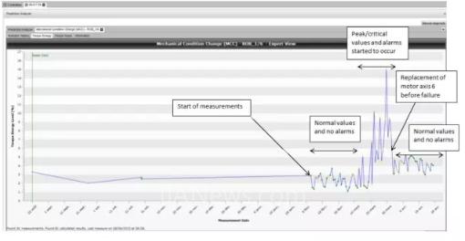 ABB(法國)機器人客戶服務經(jīng)理Robertino Cinelli表示:“我們通過遠程服務以及日常機械狀態(tài)變更 (MCC) 數(shù)據(jù)和警報分析,預測到一臺IRB6600機器人的第六根軸的電機可能發(fā)生故障,隨后立即通知客戶,并詢問客戶是否可以進行測試。很快,我們便確認了第六根軸的電機將會發(fā)生故障,并建議客戶更換電機以避免停工。最后,我們?yōu)榭蛻糁贫爽F(xiàn)場維護(更換電機)計劃。”