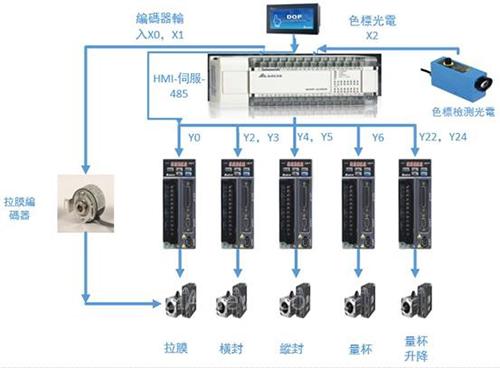 針對立題間歇式包裝機的需求,臺達提供的自動化解決方案包括PLC DVP-EH3系列、伺服驅動器ASDA-B2系列、人機界面DOP-B系列等自動化產(chǎn)品。其中,DV-PEH3系列PLC高功能標準型主機是臺達DVP-E系列的最高級主機,具備出色的運動控制功能、完整的程序保護功能、優(yōu)異的運算能力、簡易的連網(wǎng)功能以及全新的高速特殊擴充模塊等特性,使其更加適用于復雜的高速高精控制應用,滿足貼標機、包裝機、印刷機等設備的工藝需求。同樣具備領先優(yōu)勢以及特色各異的伺服驅動器ASDA-B2系列、人機界面DOP-B等產(chǎn)品與DVP-EH3系列PLC組成了一套完美的控制系統(tǒng)。臺達控制系統(tǒng)解決方案的系統(tǒng)結構框架如圖1所示。