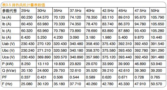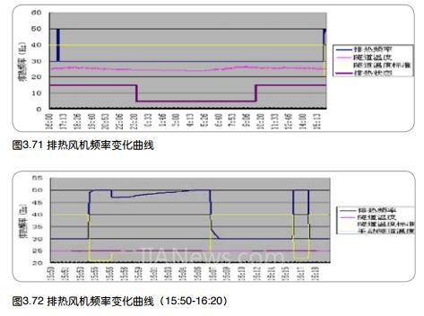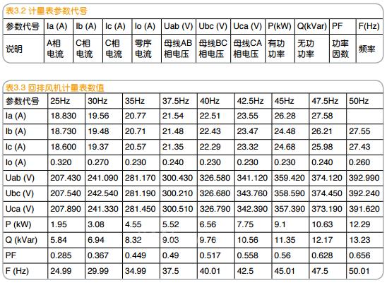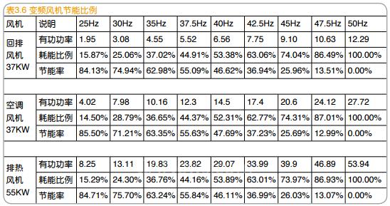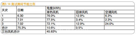 通過表3.12、表3.13電度計算,可以得到測試期間的實際節(jié)能比例,如表3.14所示。通過表3.11與表 3.6對比可以看出,測試期間排熱風機主要運行在30Hz,實際節(jié)能率達到75.3%,與表3.7的理論計算差別不大;而回排風機、空調風機主要運行在50Hz,實際節(jié)能率很小,分別為10.6%、9.9%。三臺風機的總節(jié)能率為45.83%。