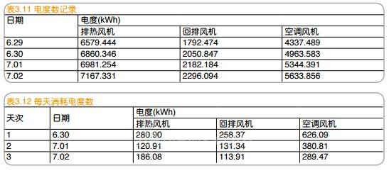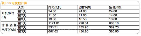 通過測試,三臺風機工頻下24h消耗的電度數(kWh)分別為排熱風機1171.008、回排風機296.636、空調風機668.104。根據測試期間三臺風機的實際開機時間,可以折算得到風機工頻下消耗的電度數,如表3.13所示。