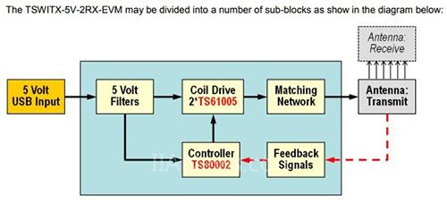 EVM的關(guān)鍵技術(shù)是Semtech TS80002和TS61005高效集成電路。TS80002控制系統(tǒng)實現(xiàn)無線電力傳輸協(xié)議,而TS61005是為發(fā)射器天線供電的MOSFET驅(qū)動器。