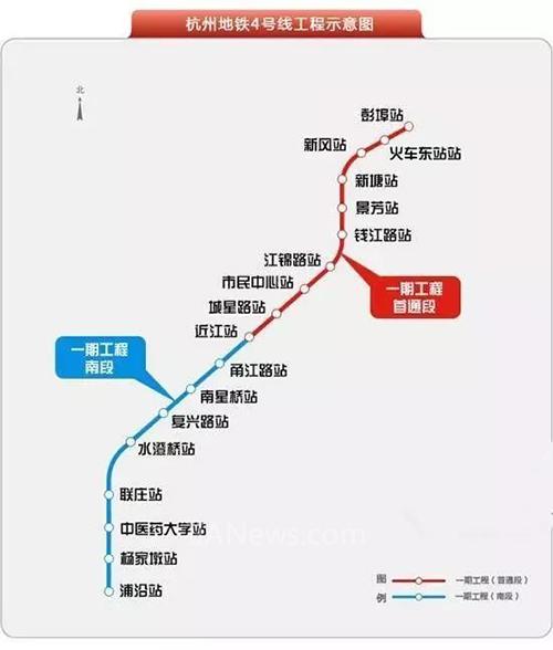作為連接城東-主城-濱江的4號(hào)線一期工程的重要組成部分,南段起于浦沿站,線路依次沿浦沿路→東信大道→錢(qián)塘江→復(fù)興路→錢(qián)江路→富春路敷設(shè),止于首通段近江站。線路全長(zhǎng)約11.2km,共設(shè)浦沿站、楊家墩站、中醫(yī)藥大學(xué)站、聯(lián)莊站、水澄橋站、復(fù)興路站、南星橋站、甬江站等8座車(chē)站,其中換乘站2座,分別為中醫(yī)藥大學(xué)站(與6號(hào)線換乘)、南星橋站(與5號(hào)線換乘)。8個(gè)站點(diǎn)行程約20分鐘。