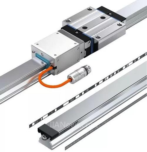 直線位置測(cè)量系統(tǒng)確定機(jī)器中運(yùn)動(dòng)部件的位置,將此信息提供給電機(jī)的控制單元,反饋回路實(shí)現(xiàn)電驅(qū)動(dòng)的精確位置控制。測(cè)量系統(tǒng)是一臺(tái)機(jī)器的核心部件,其性能對(duì)整臺(tái)機(jī)器的表現(xiàn)具有重大影響。博世力士樂(lè)開(kāi)發(fā)的IMS-A絕對(duì)式集成測(cè)量系統(tǒng),與導(dǎo)軌系統(tǒng)完全集成(圖1)。系統(tǒng)得電后無(wú)需回零即可即時(shí)得到位置,同時(shí)該產(chǎn)品無(wú)需電池。編碼器系統(tǒng)為感應(yīng)式原理,重復(fù)精度 ±0.25μm,刻尺精度3μm/m,測(cè)量精度可與光柵尺媲美。圖1(上) 為集成導(dǎo)軌的IMS-A測(cè)量系統(tǒng)。讀數(shù)頭牢固安裝于滑塊上并與之共同沿導(dǎo)軌運(yùn)動(dòng)。圖1 (下) 的爆炸圖中可以看到在導(dǎo)軌上滾道之間的側(cè)面上集成有絕對(duì)與增量刻尺,并且通過(guò)激光焊接金屬密封帶來(lái)防止污染和損壞。