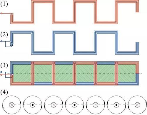 (1)第一層激發(fā)折曲,(2)第二層激發(fā)折曲,(3)疊加接收線圈位于陰影區(qū)的激勵(lì)結(jié)構(gòu),(4)電流的方向和橫截面的磁通量