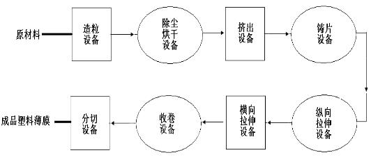 整個生產(chǎn)機組主要由造粒設備、烘干除塵設備、擠出設備、鑄片設備,縱向拉伸設備,橫向拉伸設備,收卷設備,分切設備等組成。