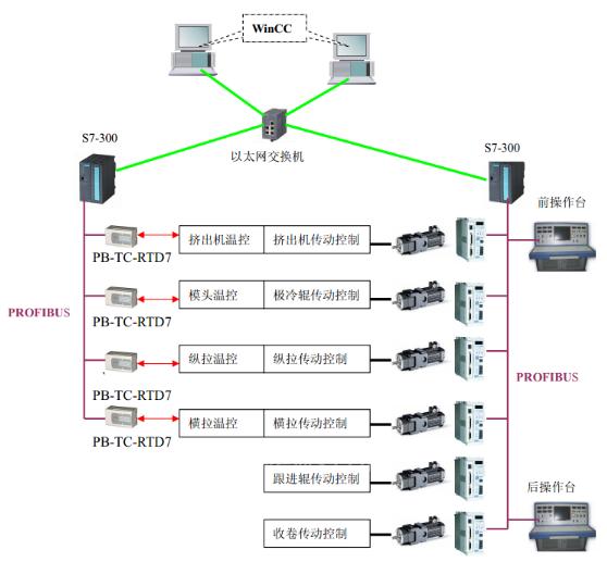 其中,PB-TC-RTD7熱電阻溫度控制器,與倫茨(LENZE)驅動器皆是由PROFIBUS協(xié)議,經(jīng)過DP電纜與西門子300系列PLC進行通訊。PLC再經(jīng)過以太網(wǎng),與上位機相連。