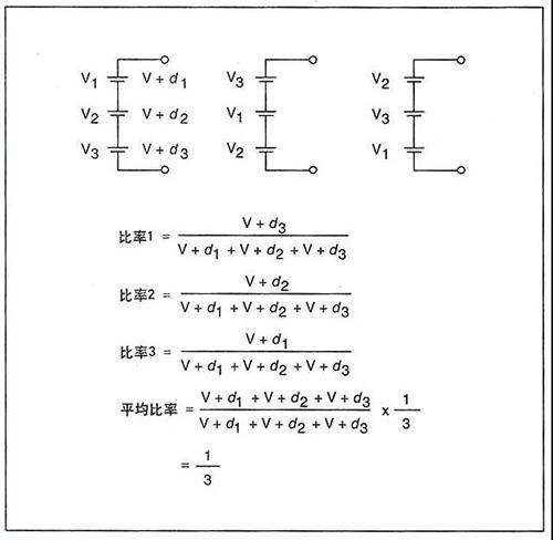 用環(huán)形參考的方法來建立準(zhǔn)確的電壓比率的基本原理是,當(dāng)對(duì)所有可能的比率進(jìn)行平均時(shí),n個(gè)串聯(lián)電壓的比率將準(zhǔn)確地為n:1。為了說明起來簡(jiǎn)單,在圖9-10中使用3個(gè)參考電壓來說明其原理。