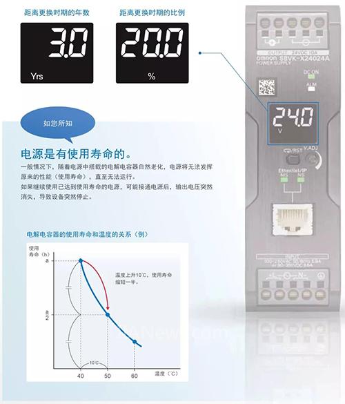 S8VK-X可根據(jù)部件溫度計算內(nèi)部搭載的電解電容器的老化情況,通過通信和顯示告知。