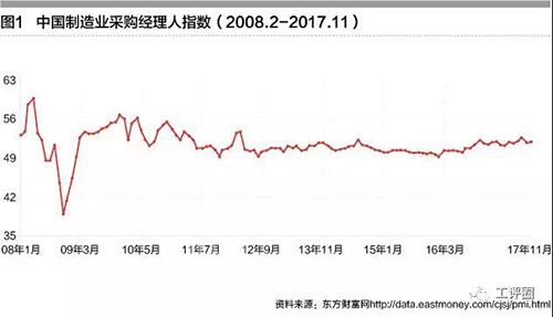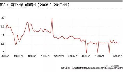 如果從整體指標(biāo)上看,目前中國制造業(yè)無疑正處于中速增長階段。國家統(tǒng)計局12月14日發(fā)布的數(shù)據(jù)顯示,2017年11月份,規(guī)模以上工業(yè)增加值同比實際增長6.1%,比10月份回落0.1個百分點。2017年1-11月份,規(guī)模以上工業(yè)增加值同比增長6.6%。而近年的制造業(yè)采購經(jīng)理人指數(shù)(PMI)也顯示,中國制造業(yè)自2012年以來即長期在50%的榮枯線上下徘徊,不復(fù)此前幾年的發(fā)展活力(參見圖1)。從工業(yè)增加值增速看,自2010年以來也一直處于下行態(tài)勢,增長幅度日益收窄(參見圖2)。這些數(shù)據(jù)和指標(biāo)無不顯示,制造業(yè)行業(yè)景氣度下滑。以鋼鐵、化工等為代表的行業(yè),整體表現(xiàn)尤其低迷,企業(yè)經(jīng)營困難,銷售下滑、負(fù)債增加、虧損頻現(xiàn)。