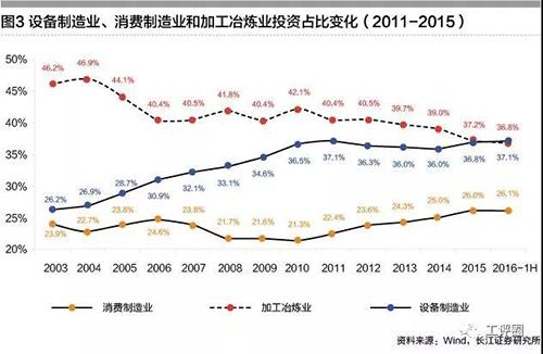 隨著中國上一輪“重化工業(yè)”發(fā)展周期的結(jié)束,以鋼鐵、石化為代表的加工冶煉業(yè)日益萎縮,并成為這一輪“去產(chǎn)能”的重點領(lǐng)域。伴隨去產(chǎn)能的是補(bǔ)短板,針對設(shè)備制造、消費(fèi)制造等的投資在制造業(yè)總投資中的份額越來越多。數(shù)據(jù)顯示,在制造業(yè)三大門類中,設(shè)備制造業(yè)投資呈現(xiàn)逐年穩(wěn)步擴(kuò)張態(tài)勢,其占比從2003年的26.2%大幅上升至當(dāng)前的37.1%,占比排名躍升至第一;消費(fèi)制造業(yè)投資占比從2003年的23.9%增加至當(dāng)前的26.1%;而加工冶煉制造業(yè)則是三大類中收縮最為明顯的行業(yè),其投資占比已從2003年的46.2%大幅下滑9.4個百分點至當(dāng)前的 36.8%,排名也由第一降至第二(參見圖3)。