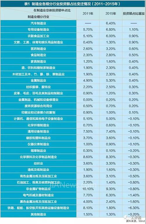 從制造業(yè)內(nèi)部各細(xì)分行業(yè)投資額占比變遷情況來看,上述態(tài)勢表現(xiàn)得更加突出和明顯。數(shù)據(jù)顯示,與2011年相比,在制造業(yè)相關(guān)的31個細(xì)分行業(yè)中,2015年投資額占比增加最多的五大行業(yè)分別是:專用設(shè)備制造業(yè),農(nóng)副食品加工業(yè),文教、工美、體育和娛樂用品制造業(yè),醫(yī)藥制造業(yè),食品制造業(yè)(汽車制造業(yè)因缺乏2011年數(shù)據(jù),故不在比較之列);而投資額占比增加最少的五大行業(yè)分別是:石油加工、煉焦及核燃料加工業(yè),非金屬礦物制品業(yè),電氣機(jī)械及器材制造業(yè),黑色金屬冶煉及壓延加工業(yè),鐵路、船舶、航空航天和其他運(yùn)輸設(shè)備制造業(yè)(參見表1)。