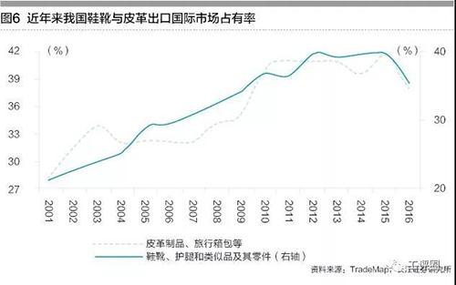 在此背景之下,我國傳統(tǒng)上具有出口優(yōu)勢的服裝、皮革和鞋靴等勞動密集型產(chǎn)品,在2010年后出口競爭力逐步減弱。比如,針織服裝的國際市場占有率于2013年達(dá)到最高值41.1%,此后逐年回落至2016年的34.0%。針織服裝貿(mào)易競爭力指數(shù)于2010年達(dá)到最高值0.98,此后逐年回落至2016年的0.94(參見圖5、圖6)。