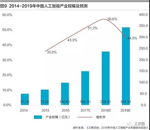 首先,從發(fā)展增速上看,我國新興和高端制造的發(fā)展速度和潛力超過傳統(tǒng)制造。以人工智能為例,雖然其目前在我國還處于初步發(fā)展階段,但其產(chǎn)業(yè)規(guī)模一直保持著較高的增速,2015年、2016年的同比增速分別為35.8%、43.3%,并且人工智能的產(chǎn)業(yè)規(guī)模增速也有不斷增加的趨勢。預(yù)計2020年前,人工智能產(chǎn)業(yè)規(guī)模將保持較高的年均增長率(參見圖9)。