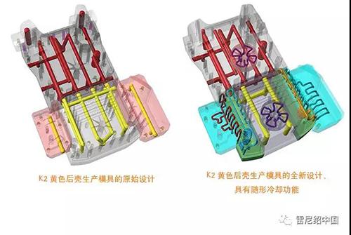 根據(jù)模擬結(jié)果,雷尼紹為K?rcher提出了一個(gè)全面的改進(jìn)方案,指出隨形冷卻可用于改進(jìn)模具中熱點(diǎn)區(qū)域的溫度控制,從而使各個(gè)部分的冷卻速率更均勻,并減少整體冷卻時(shí)間。修改后的模具設(shè)計(jì)加入了兩個(gè)增材制造的模芯,可向確定的熱點(diǎn)區(qū)域提供隨形冷卻功能。