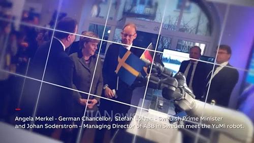 德國(guó)總理默克爾、瑞典首相勒文和ABB瑞典總經(jīng)理約翰?索德斯特朗共同參觀了YuMi機(jī)器人。