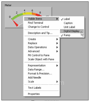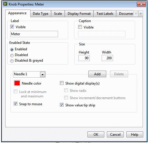 前面板窗口的對象也有屬性對話框,用于改變前面板對象的外觀或者動(dòng)作。要打開屬性對話框,請右鍵單擊對象,從快捷菜單中選擇屬性。圖9顯示了圖8所示Meter的屬性對話框。對象屬性對話框中的選項(xiàng)與該對象快捷菜單中的選項(xiàng)類似。