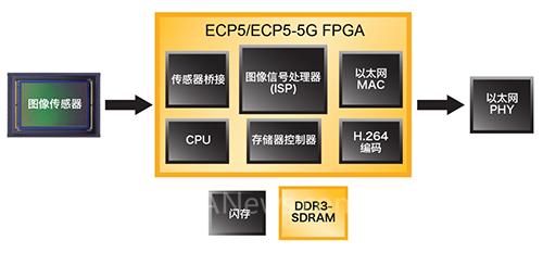 在工業(yè)領(lǐng)域,基于ECP5 FPGA的協(xié)處理能夠發(fā)揮重要作用,可用于降低視頻攝像頭、監(jiān)控和機(jī)器視覺應(yīng)用中應(yīng)用處理器、ASIC或ASSP的計(jì)算負(fù)載。圖1展示了一款典型的工業(yè)攝像頭應(yīng)用。在下方的圖示中,F(xiàn)PGA位于圖像傳感器和以太網(wǎng)PHY之間。圖像傳感器將圖像數(shù)據(jù)流傳輸?shù)紽PGA,然后FPGA基于H.264編碼進(jìn)行圖像處理或圖像壓縮。FPGA的片上嵌入式RAM塊(Embedded Block RAM, EBR)和DSP塊實(shí)現(xiàn)高性能寬動(dòng)態(tài)范圍(WDR)和圖像信號(hào)處理(ISP)功能。最后,F(xiàn)PGA將圖像數(shù)據(jù)通過以太網(wǎng)進(jìn)行傳輸。