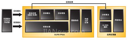 在圖3所示的智能交通攝像頭實(shí)例中,F(xiàn)PGA基于傳感器捕獲的圖像數(shù)據(jù)檢測(cè)到車輛牌照,即使在低光照或強(qiáng)背光條件下亦能執(zhí)行圖像增強(qiáng)以生成清晰圖像 - 針對(duì)目標(biāo)(車牌)和背景(圖像中的剩余部分)使用不同的曝光設(shè)置,然后融合目標(biāo)和背景圖像以生成更清晰的圖像。然后,F(xiàn)PGA生成的目標(biāo)偵測(cè)結(jié)果輸入到應(yīng)用處理器運(yùn)行的分析算法。使用ECP5 FPGA的并行處理器架構(gòu)分擔(dān)分析算法中計(jì)算密集程度最高的步驟,智能攝像頭能夠在保持低功耗的同時(shí)提高性能。