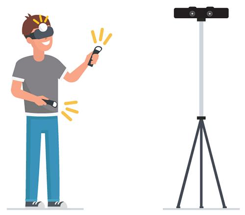 圖4:使用立體攝像頭(放置在房間內(nèi))的“outside-in”位置追蹤解決方案,通過捕獲安裝在用戶頭盔和手柄控制器上的LED標(biāo)記來跟蹤用戶的身體和手部動(dòng)作
