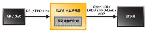 圖8:在車載信息娛樂系統(tǒng)中,ECP5 FPGA可用于預(yù)處理和后處理功能,并實(shí)現(xiàn)應(yīng)用處理器和顯示屏之間的視頻橋接