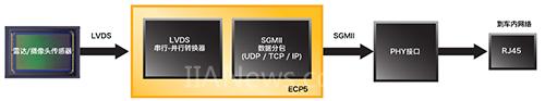 另一個(gè)橋接、聚合和協(xié)處理解決方案實(shí)例則使用萊迪思汽車級(jí)FPGA的3.2 Gbps SERDES功能聚合來自多個(gè)雷達(dá)或攝像頭的數(shù)據(jù),并通過BroadR-Reach或以太網(wǎng)等汽車內(nèi)部網(wǎng)絡(luò)??傳輸。在圖10中,來自多個(gè)傳感器的數(shù)據(jù)通過LVDS接口傳輸?shù)紼CP5 FPGA,然后ECP5 FPGA對(duì)數(shù)據(jù)進(jìn)行聚合和打包,通過基于SERDES的SGMII接口傳輸?shù)狡噧?nèi)部網(wǎng)絡(luò)。