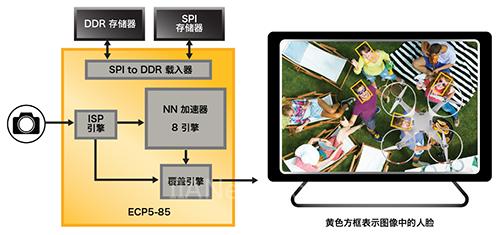 除了上文中提到的ISP外,ECP5 FPGA還可以實(shí)現(xiàn)視頻分析功能,進(jìn)一步減輕應(yīng)用處理器的計(jì)算密集型任務(wù),從而降低系統(tǒng)功耗、實(shí)現(xiàn)更高的實(shí)時(shí)性能。FPGA可為智能攝像頭應(yīng)用實(shí)現(xiàn)目標(biāo)偵測(cè)、圖像處理和圖像增強(qiáng)等解決方案。例如,偵測(cè)目標(biāo)可以是監(jiān)控?cái)z像頭實(shí)例中的人臉圖像或是交通攝像頭實(shí)例中的車牌。
