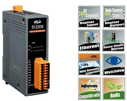 ET-2255U模塊提供 8個干/濕接點 (Dry/Wet Contact) 數(shù)字輸入通道,可經(jīng)由接線方式來選擇8個sink-type或source-type數(shù)字輸出通道,2-Port 的 Ethernet Switch, 可使用 Daisy-chain 的接線來串連設(shè)備,使其安裝上更具靈活性,并且簡化安裝及降底基礎(chǔ)設(shè)施成本,還具有光隔離 3000 Vrms 的瞬間過電保護(hù)功能,但不具有通道至通道的隔離功能。每一個輸入通道可作為一個32位計數(shù)器,而每一個輸出通道可以驅(qū)動500 mA負(fù)載,且可設(shè)定 Power-on 及 Safe 值,能夠安全的在具有危險電壓應(yīng)用中使用。ET-2255U 模塊還具有 8 kV 靜電放電 (ESD) 防護(hù)、4 kV 電快速瞬變 (EFT) 防護(hù)、3 kV 電涌防護(hù)以及 3750 VDC 輸出入隔離,在工業(yè)環(huán)境中也加強了噪聲防護(hù)能力。