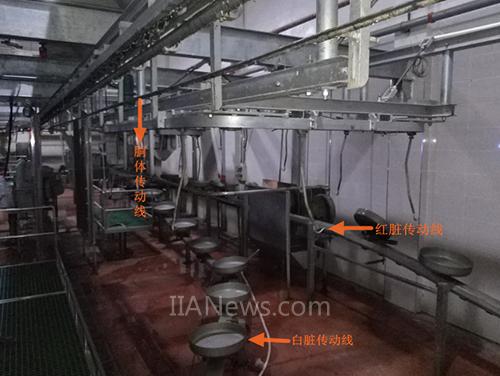 在生產(chǎn)過(guò)程中,被開(kāi)膛的豬胴體經(jīng)過(guò)胴體傳送鏈條時(shí),會(huì)掛在傳動(dòng)鏈條上,輸送到操作臺(tái),此時(shí)會(huì)與白臟線同步定位,操作工人將白臟切下,放入托盤(pán)中。胴體會(huì)一直往前輸送,到達(dá)紅臟掛鉤處,工人將紅臟切下,掛在掛鉤上。