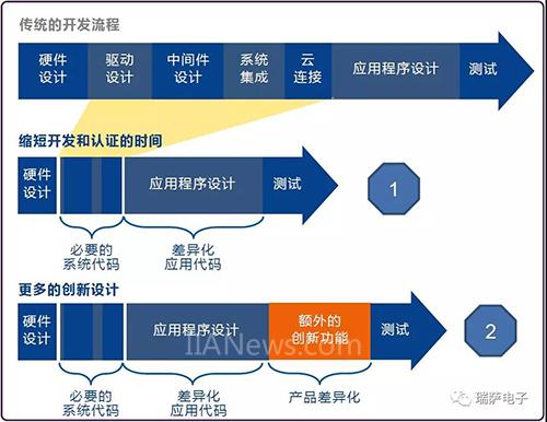 我們從上面的開發(fā)流程①可以看到,如果能夠從傳統(tǒng)的開發(fā)流程中縮短嵌入式MCU 的底層驅(qū)動、中間件和、系統(tǒng)集成以及云連接代碼的開發(fā)時(shí)間,可以大大提高開發(fā)效率,縮短產(chǎn)品開發(fā)周期。從開發(fā)流程②可以看到,在做產(chǎn)品創(chuàng)新時(shí),可以更加容易快速的添加產(chǎn)品差異和創(chuàng)新功能代碼,從而節(jié)省寶貴的設(shè)計(jì)時(shí)間,并將產(chǎn)品更快地推向市場,贏得市場先機(jī)。