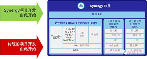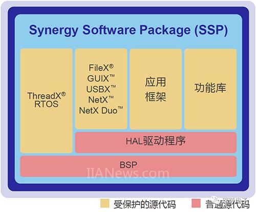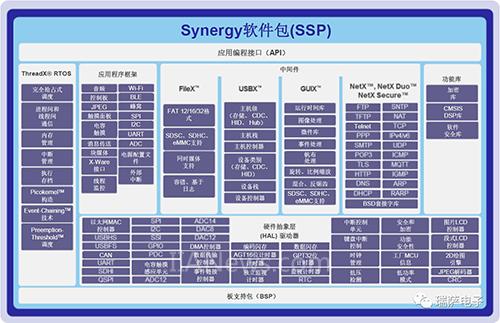 Synergy Software Package ( SSP) 包含了MCU的板級支持包BSP、硬件抽象層HAL、中間件以及RTOS、應(yīng)用程序框架和一些功能庫以及應(yīng)用程序接口API。