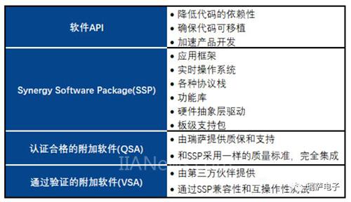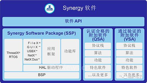 Synergy?軟件主要由Synergy Software Package ( SSP)、軟件API、認(rèn)證合格的附加軟件 (QSA)、通過驗(yàn)證的附加軟件 (VSA)這幾大部分組成。其中Synergy Software Package (SSP)是Synergy?軟件的核心,它是瑞薩認(rèn)證合格的軟件包,并由瑞薩提供質(zhì)保。軟件API為應(yīng)用框架、協(xié)議棧、運(yùn)行庫、HAL驅(qū)動和BSP提供標(biāo)準(zhǔn)化的C語言應(yīng)用程序接口。QSA和VSA則是一些通過認(rèn)證或驗(yàn)證的附件軟件。