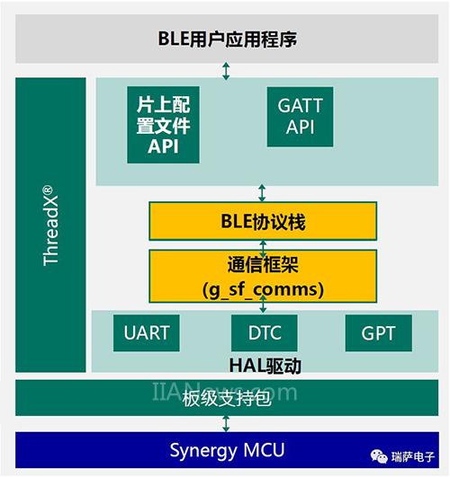 低功耗藍(lán)牙BLE應(yīng)用框架可以在應(yīng)用中輕松集成BLE連接,此框架支持BLE模塊初始化和配置、通用屬性配置文件(GATT)API和片上配置文件API。BLE框架還支持多模式協(xié)議棧配置,可以配置協(xié)議棧運(yùn)行在主機(jī)MCU上,也可以運(yùn)行在SOC模塊上。該BLE框架同樣具有很好的兼容性,很容易為新BLE模塊添加驅(qū)動程序,可以在Synergy? Gallery的合作商項(xiàng)目中查找附加的BLE驅(qū)動。