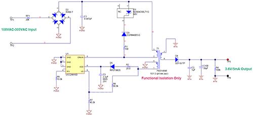 108VAC-305VAC輸入電壓、3.6V/5mA返馳式參考設(shè)計(jì)是一個(gè)極小型高壓和低壓線路交流輸入,通過(guò)UCC28910,在18mW 條件下變?yōu)?.6V。