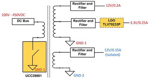 PMP30044參考設(shè)計(jì)使用UCC28910準(zhǔn)諧振反激式轉(zhuǎn)換器來(lái)產(chǎn)生隔離輸出(12V@ 0.35A)。UCC28910集成了一個(gè)700V的功率FET,并提供初級(jí)側(cè)調(diào)節(jié),無(wú)需光電耦合器,減少了總組件數(shù)量。是一個(gè)低成本高效益的設(shè)計(jì)。