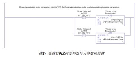 由于ControlLogix 系統(tǒng)的開放性及靈活性,可以在燒結(jié)L1網(wǎng)絡(luò)的任意位置通過Drive Executive工具對變頻器進行組態(tài)及維護,也可以由PLC經(jīng)由ControlNet 網(wǎng)絡(luò)通過20-COMM-C模塊修改變頻器控制參數(shù)。這里由于兩臺馬達動態(tài)參數(shù)有較大的差別,為了達到理想的控制效果,在起動前由PLC寫入針對該馬達的控制參數(shù)。程序如圖3所示。