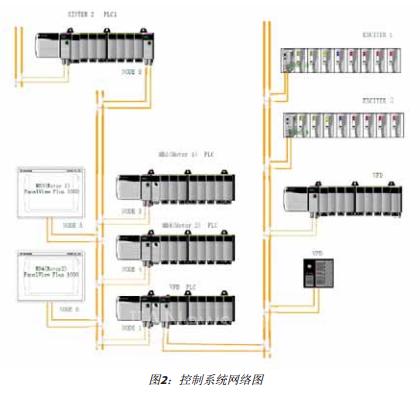 系統(tǒng)的網(wǎng)絡(luò)結(jié)構(gòu)如下圖所示:每個主排風(fēng)機有一個獨立的監(jiān)控PLC以及 PanelView Plus 1000作為人機界面接口。這些設(shè)備以及變頻器的PLC通過1756- CNBR模塊組成ControlNet網(wǎng)絡(luò),這個網(wǎng)絡(luò)通過燒結(jié)主系統(tǒng)的PLC2遠程IO站與燒結(jié)主系統(tǒng)L1網(wǎng)絡(luò)連接.變頻器(VFD)PLC有一個ControlNet IO網(wǎng)絡(luò),兩個Point IO 分別控制MB3(Motor1)、MB4(Motor2)的勵磁盤,1756-A10框架及20-COMM-C完成變頻器本體的控制及數(shù)據(jù)交換,本地框架主要是高壓盤等外圍接口狀態(tài)采集及控制。