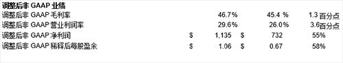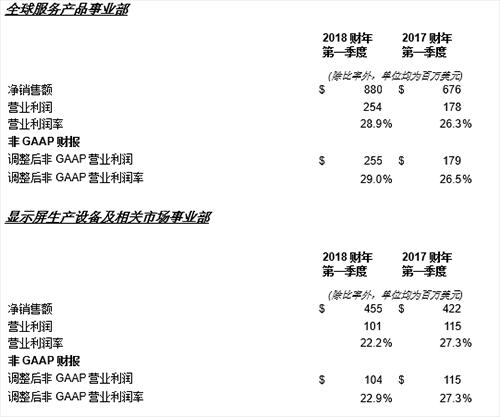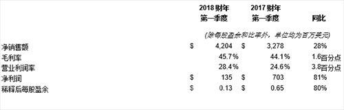 在調(diào)整后的非GAAP基礎上,公司同期增加毛利率1.3個百分點至46.7%,營業(yè)收入增長46%達12.5億美元,占凈銷售額的29.6%。每股盈余增加58%至1.06美元,其中不包括與美國近期稅收立法有關的費用。 此外,非GAAP每股盈余包含0.04美元的收益,這是由于近期美國稅收立法的變化導致公司的2018財年稅率相較此前預期有所下降。
