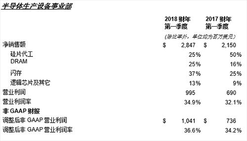 與2017財年第一季度相比,應用材料公司的凈銷售額攀升28%至42億美元?;贕AAP(一般公認會計原則),公司毛利率提高1.6個百分點至45.7%,營業(yè)收入增長48%至12億美元,占凈銷售額的28.4%。GAAP每股盈余(EPS)降至0.13美元,原因是因為近期美國稅收立法有關的一次性收費將每股盈余減少約0.94美元。