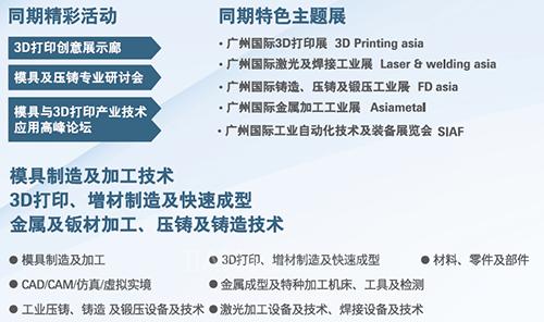 第十二屆廣州國際模具展覽會(Asiamold)將于2018年3月4至6日于廣州中國進出口商品交易會展館隆重舉行。展會致力為模具、壓鑄及鍛壓和增材制造行業(yè)展示前沿技術、產(chǎn)品及方案。Asiamold將再次與SIAF廣州國際工業(yè)自動化技術及裝備展覽會同期舉行,預計兩展共同吸引來自20個國家及地區(qū)、共850家參展商,總展覽面積超過60,000平方米。