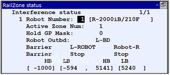 使用本功能,機器人之間需要建立通訊聯(lián)系,并調整機器人的系統(tǒng)設置,在已經預設好的條件下,導軌上各臺機器人可根據當前實時位置來判斷機器人之間是否存在干涉情況。該功能需要添加軟件(Intelligent Interference Check)。