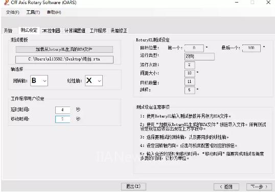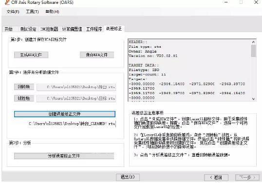 5.點(diǎn)擊下一步,進(jìn)入誤差修正,首先使用XR20-W軟件測量出轉(zhuǎn)臺(tái)誤差M1,再生成RTA并保存,使用角度測量軟件導(dǎo)入生成的RTA,測量出線性軸角度誤差M2(角度測量目的是消除線性軸配合轉(zhuǎn)臺(tái)移動(dòng)線性軸產(chǎn)生的角度誤差,這個(gè)誤差一般比較小,現(xiàn)場測試在2角秒以內(nèi),測量時(shí)注意角度正負(fù)號判斷,具體參考說明書),點(diǎn)擊回轉(zhuǎn)軸導(dǎo)入M1文件,點(diǎn)擊線性軸導(dǎo)入M2文件,創(chuàng)建誤差修正文件,并分析結(jié)果數(shù)據(jù)。